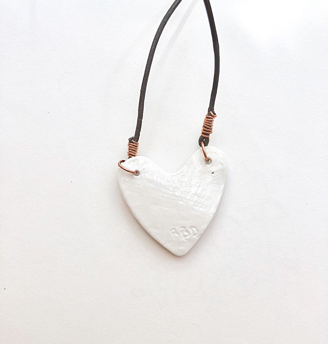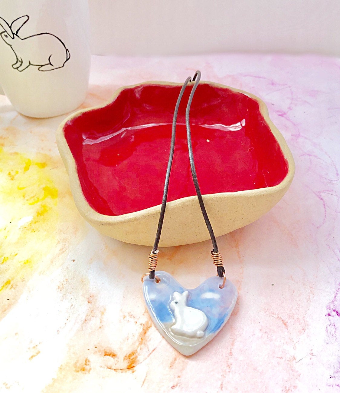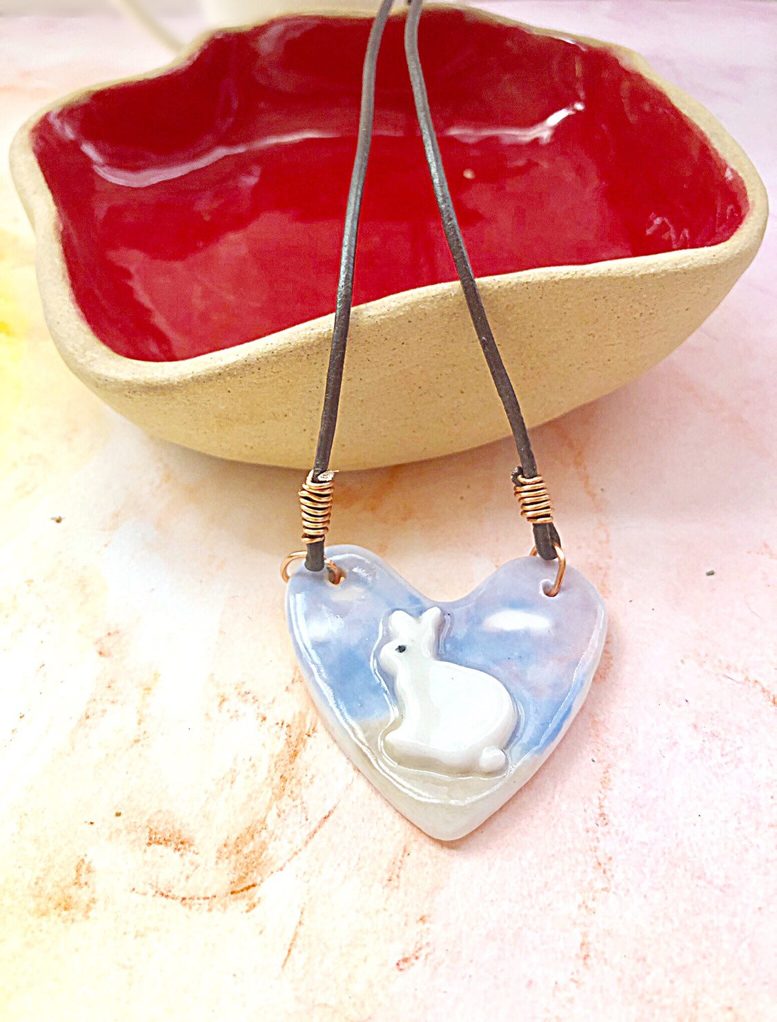 This wonderful Bunny Heart Necklace is made with a Porcelain clay pendant which features a Blue/pink sky scene as back ground. Beautifully finished with glaze and a leather necklace fitted with copper wire wrap. I am sure the customers will love it!
