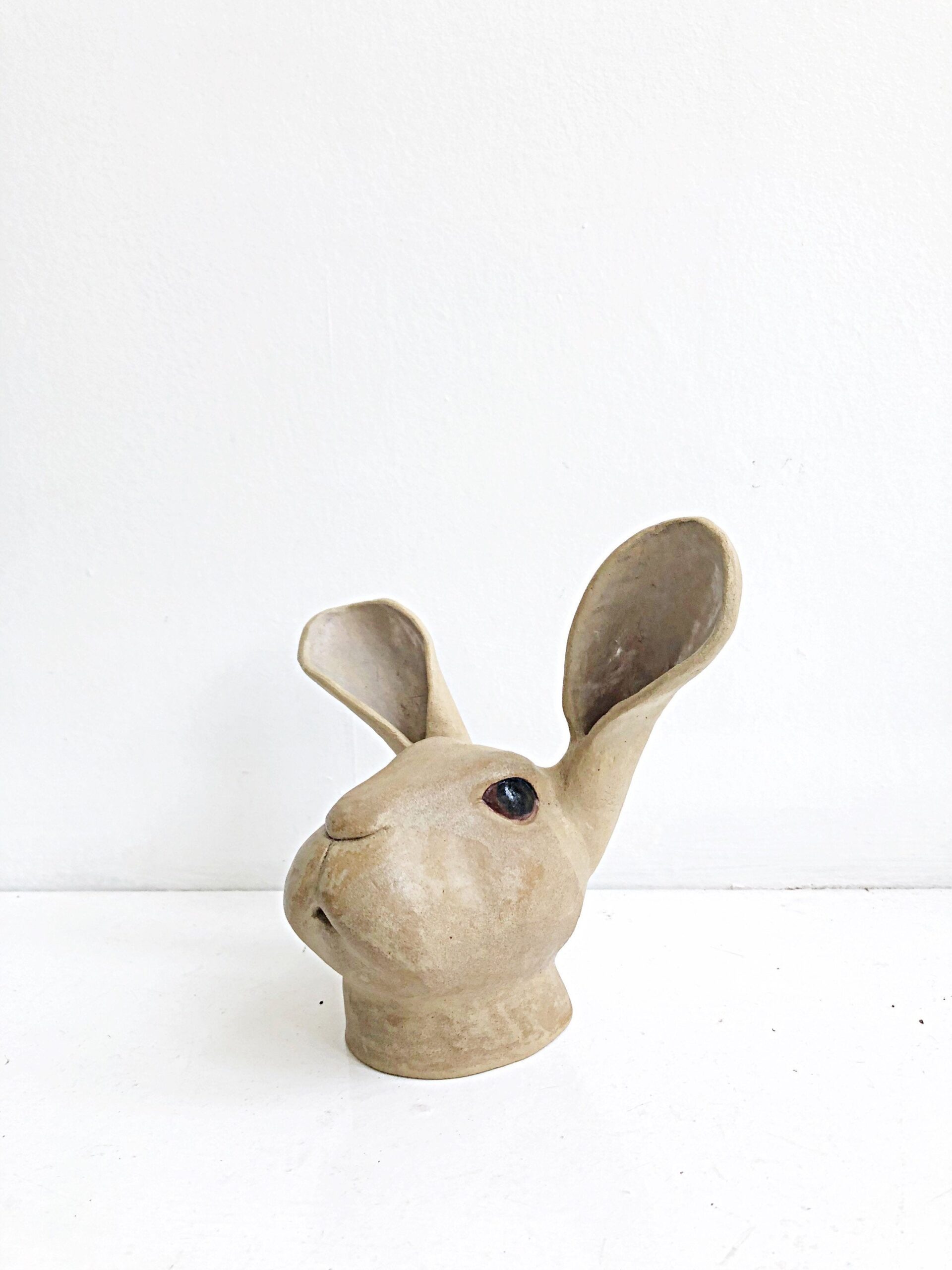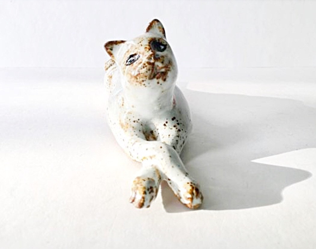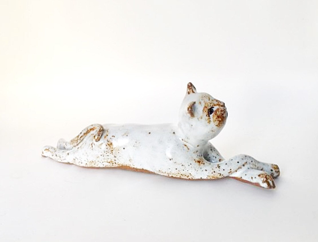 The cat sculpture is made with stoneware clay, glazed and fired twice. The eyes are painted with porcelain paint and heat treated.
