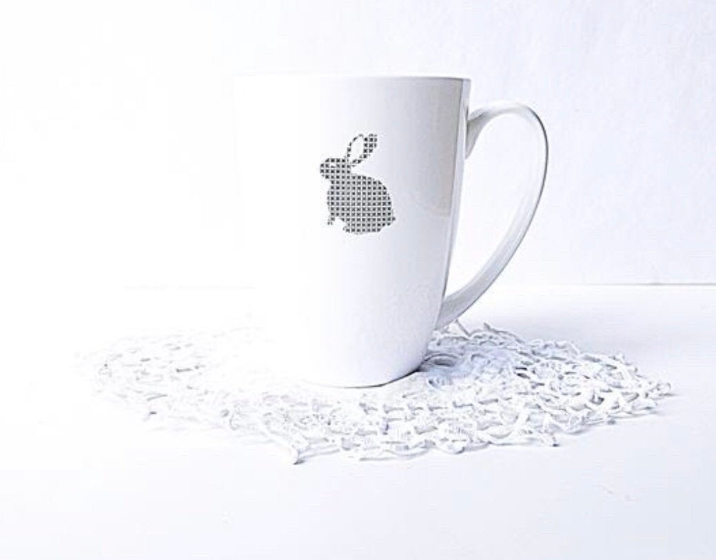 This elegant porcelain White Rabbit Mug has a simple yet stylish rabbit design on both sides and will make a great gift. The contemporary line drawing of a rabbit who is resting was originally a sketch in preparation for making ceramic sculptures. It would be difficult to resist an offer of coffee or hot chocolate in a mug like this. The design is perfectly suitable for any occasion not just for rabbit lovers. I first used rabbit designs at my graduation show at university about 12 years ago when there were practically no rabbits in home decor. Today, more and more rabbit designs are being created everywhere and customers seem to reach for products that contain a rabbit design. So the rabbit has become a popular figure of decoration.